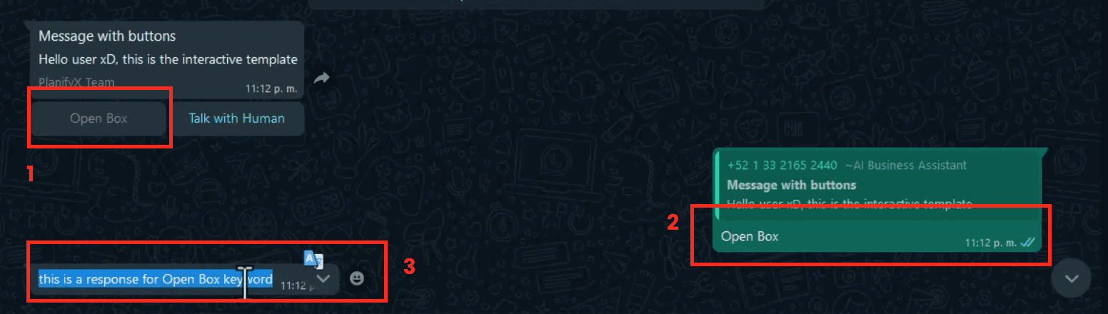 Test the Chatbot’s Functionality. To ensure everything is working correctly, use the quick reply button “openbox” in a test message. The chatbot should respond with the predefined message, “this is a response for openbox keyword,” confirming the setup is successful.