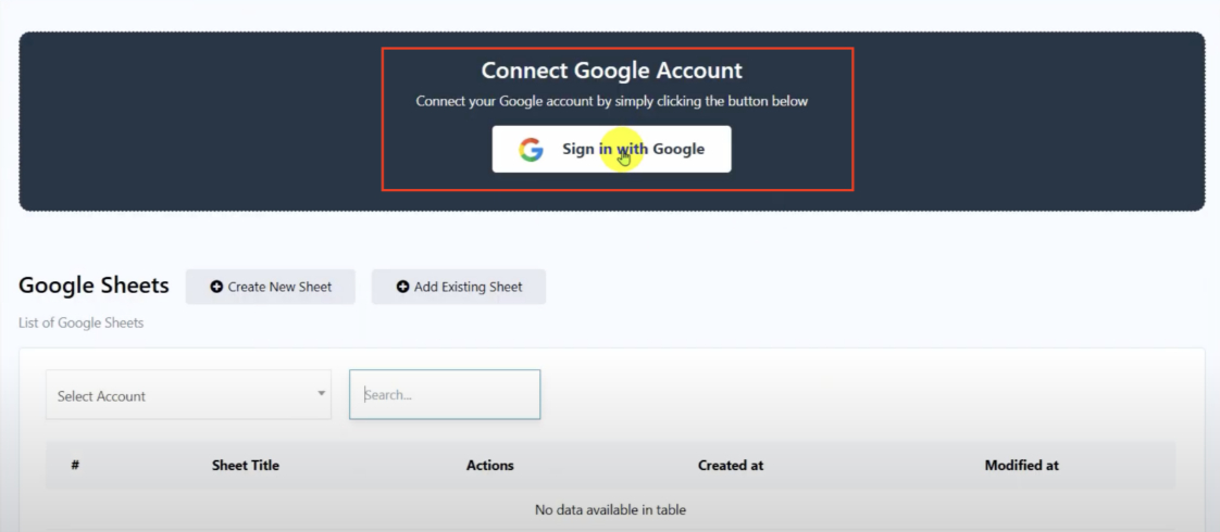 Connect your Google Account to BotCommerce. From your dashboard, click on Settings, then select Google Sheet. Click on Sign in with Google to link your account.