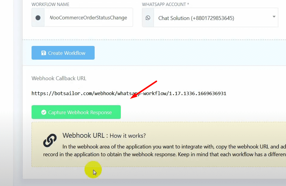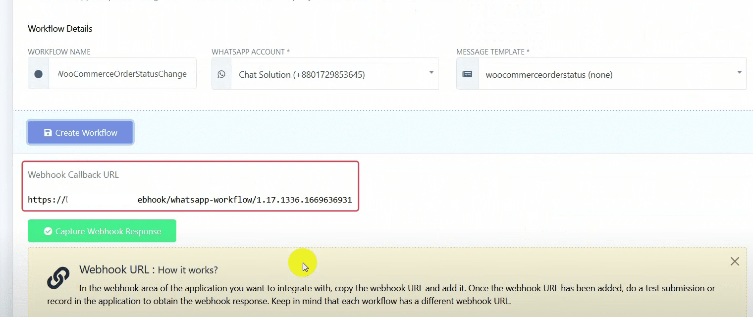 Click on “Create Workflow” to generate a webhook callback URL. Copy the URL.