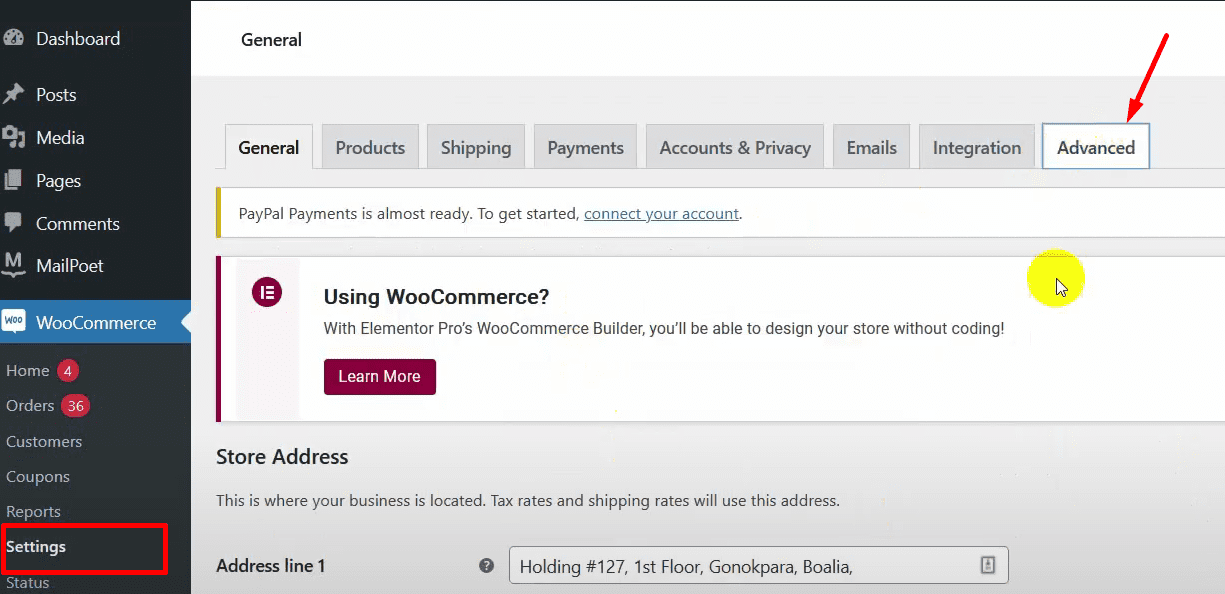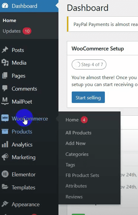 Go to the WordPress admin dashboard and select WooCommerce.