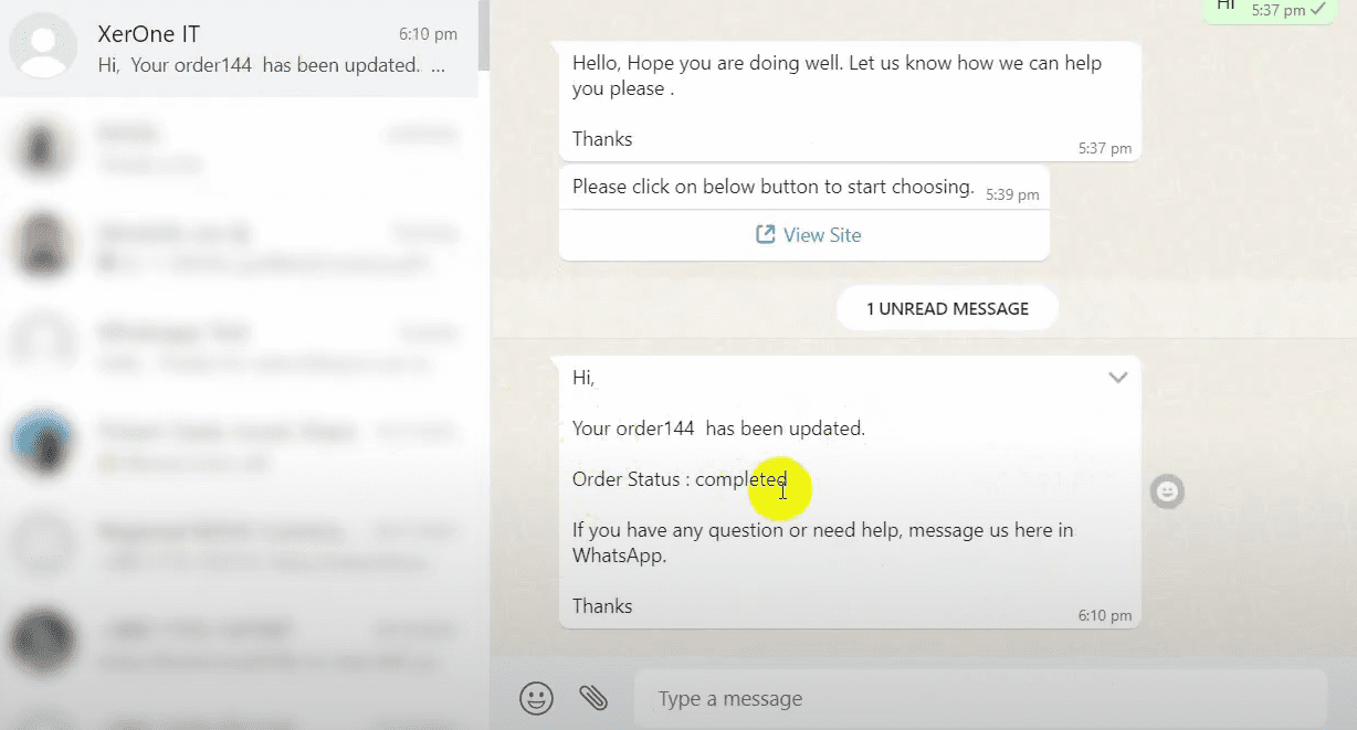 Check WhatsApp to confirm that the message with the order status change has been received.