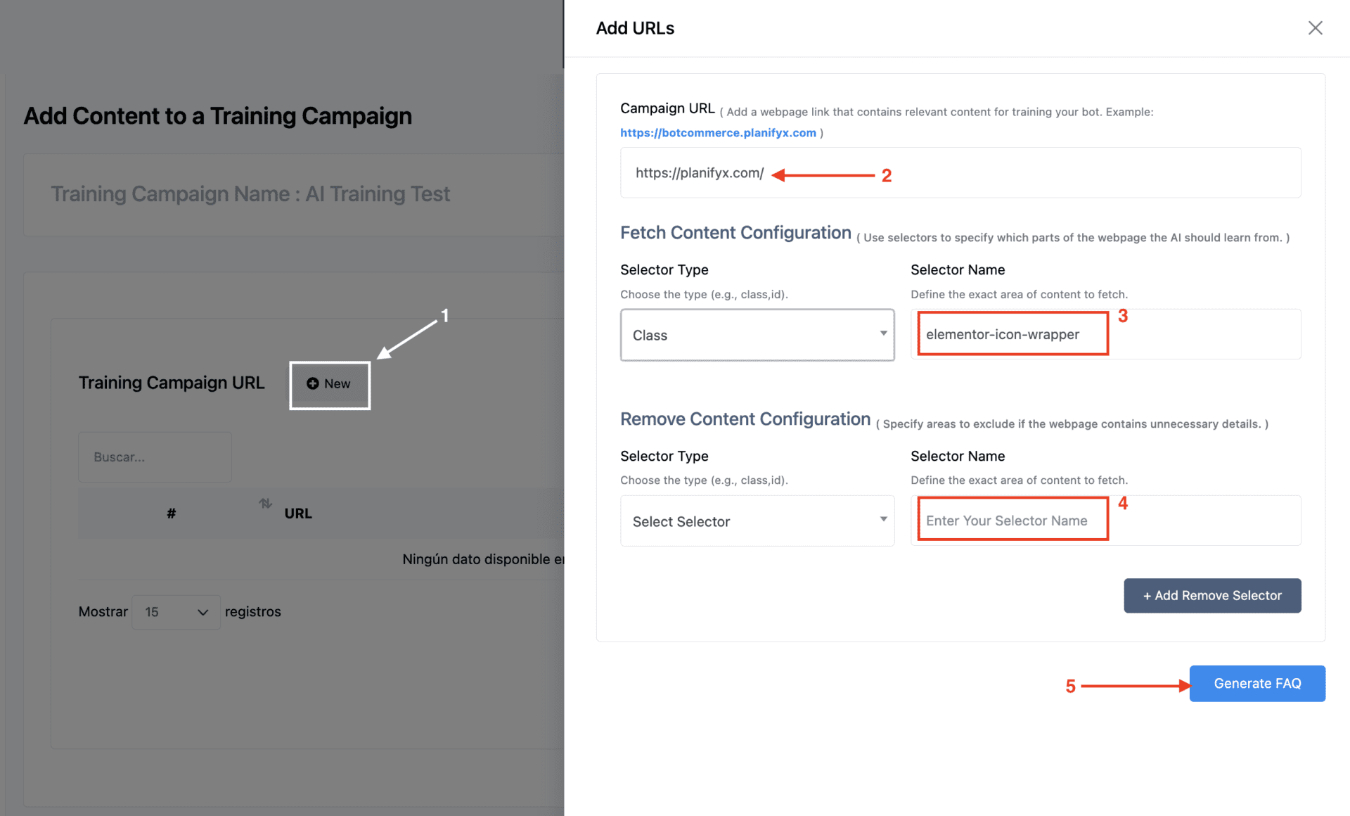 The basic way to add more content to the AI training campaign is manually inputting FAQs. Write the question first, put a line break and add the answer. You can provide as many FAQs as you want by clicking the add more FAQs button.