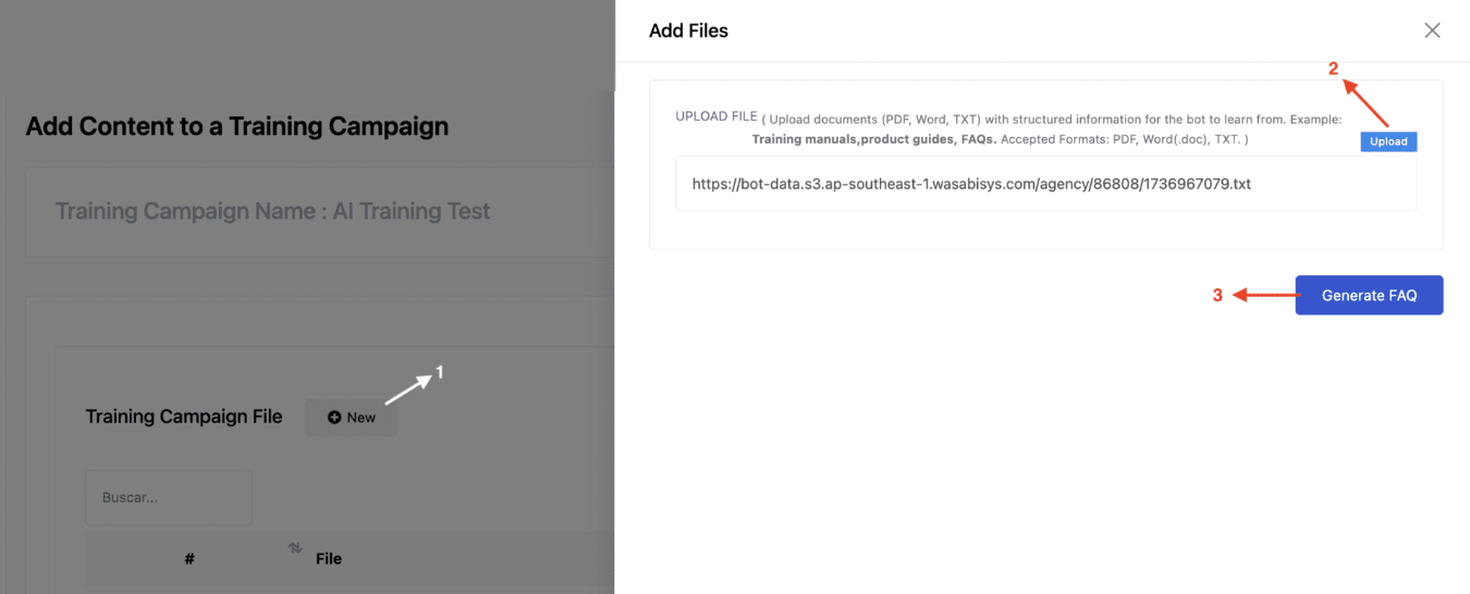 You can upload text, DOC, and PDF files (up to 2MB) to enhance your AI training.