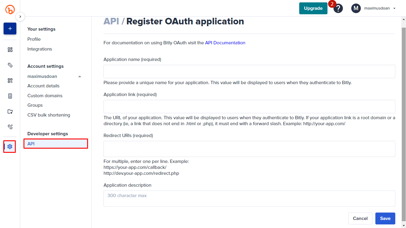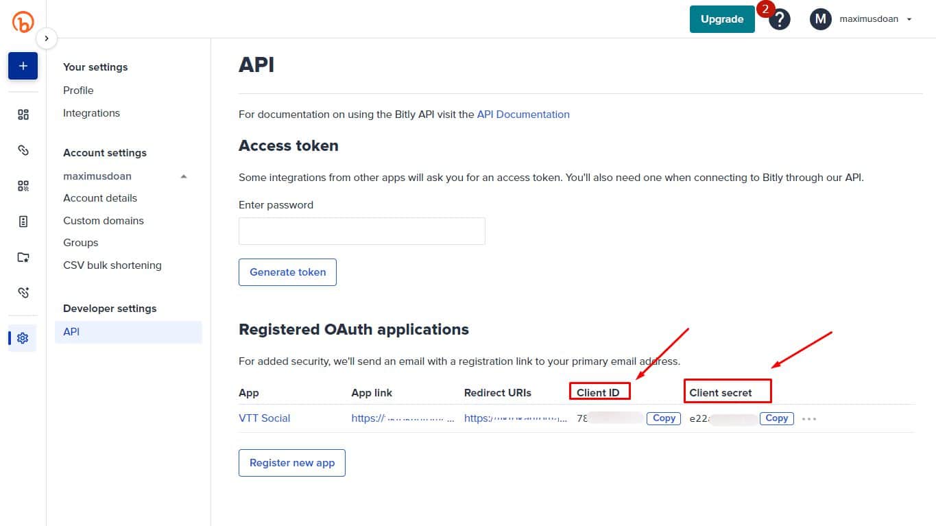 Register the App. First, you need to registering the OAuth application.Click this link to create the Bit.ly app: https://app.bitly.com/settings/api/oauth/