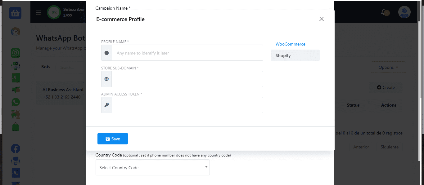 Fill out the required fields for E-commerce Profile, including profile name, store sub-domain, and admin access token.