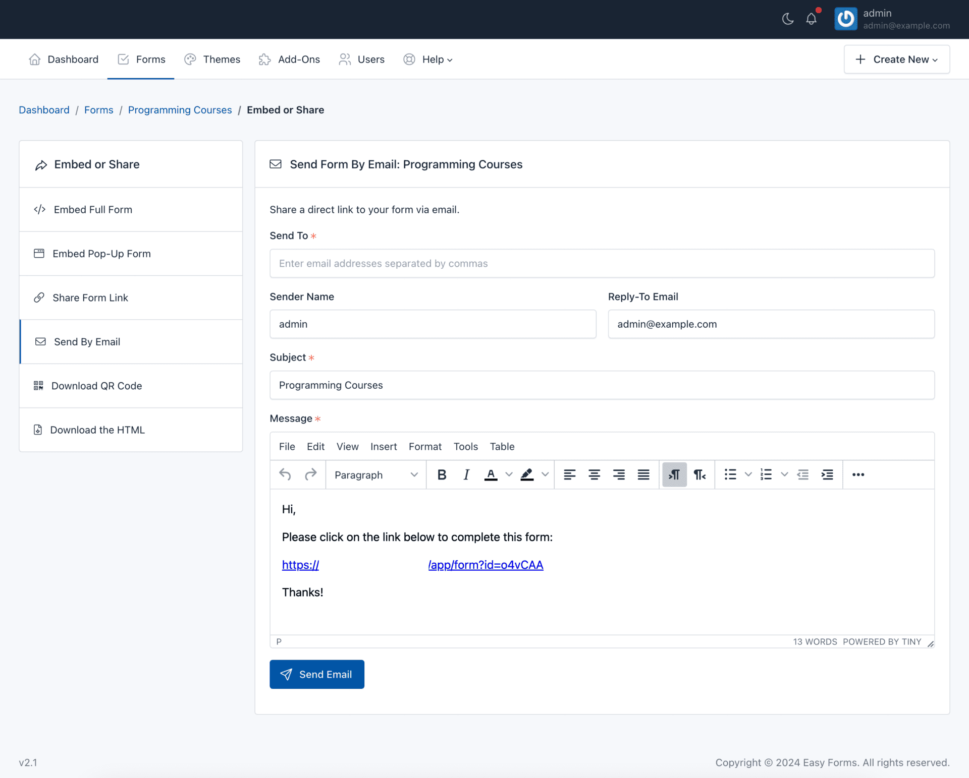 QuickForms offers a straightforward way to send an email to your users and include the Form URL. To send a form by email, follow the next steps: