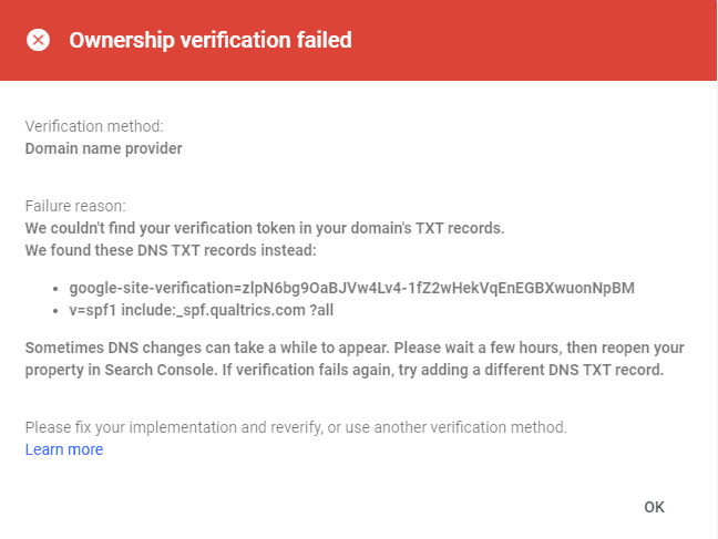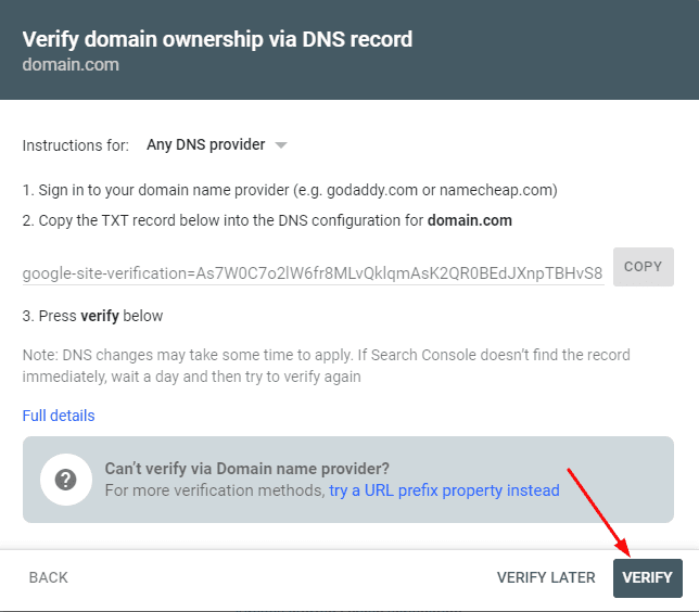 7. After a few minutes, return to Google Search Console and click Verify.