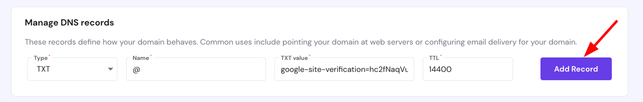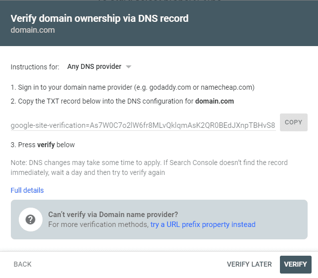 6. Open a new browser tab and access your domain’s DNS zone to create a TXT record. Here, you’ll need the verification code given by Google Search Console.