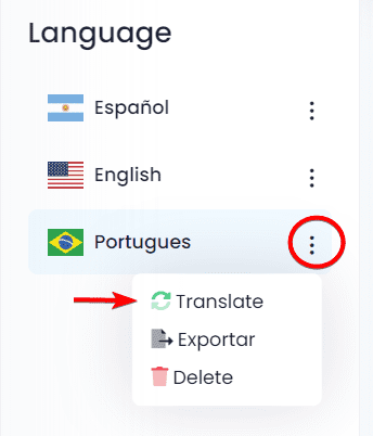 Select a language. You’ll see on the screen the list of languages available on your platform. There, you should click on the three dots next to the language and choose ‘Translate’.