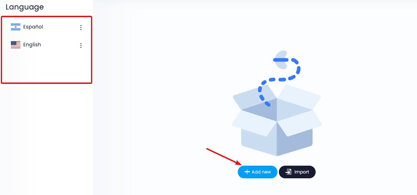 Click on ‘Import’ and select the JSON file you previously downloaded. Once imported, a success message will appear, the page will reload, and the language will be added to the left panel.