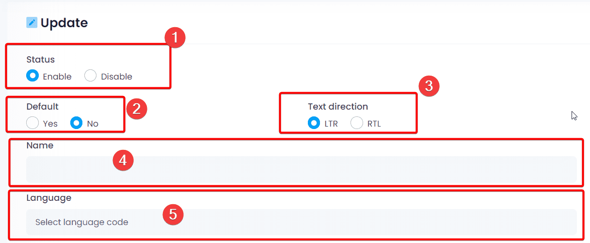 Configure the new language. Here you can establish if the new language will be active or not (1), if it will be the default language (2), the text orientation (3), the name (4), and the language code (5). Then, you should scroll down to the bottom of the page, and you’ll see the following: