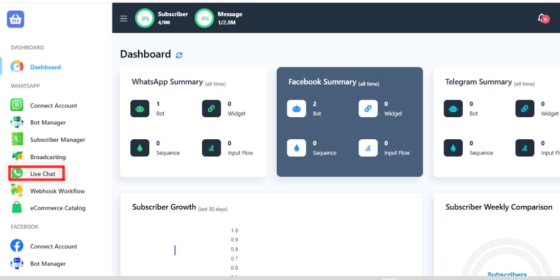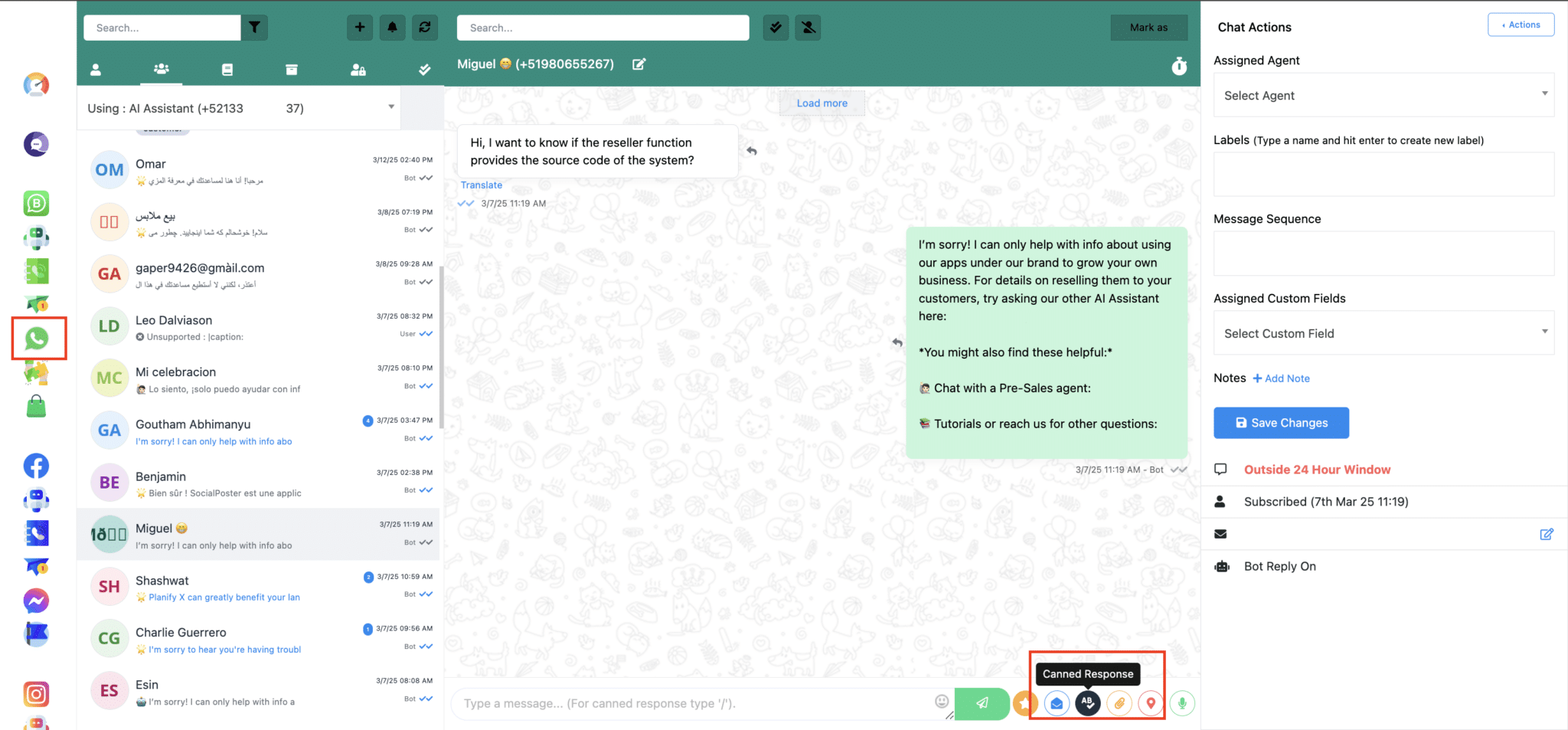 Access the Live Chat. From the dashboard, navigate to the live chat section of the platform where you wish to use canned responses. For example, here we are using WhatsApp.