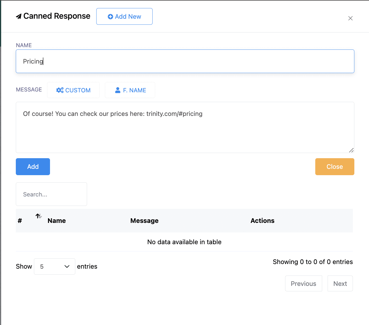 Provide a name for the canned response. Write the message you want to save as a canned response. Click on the Add button.