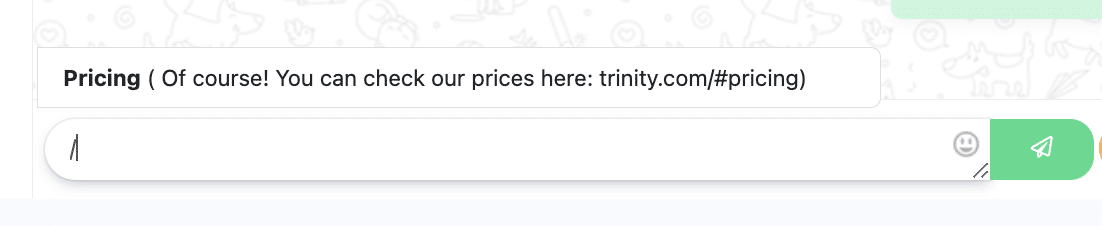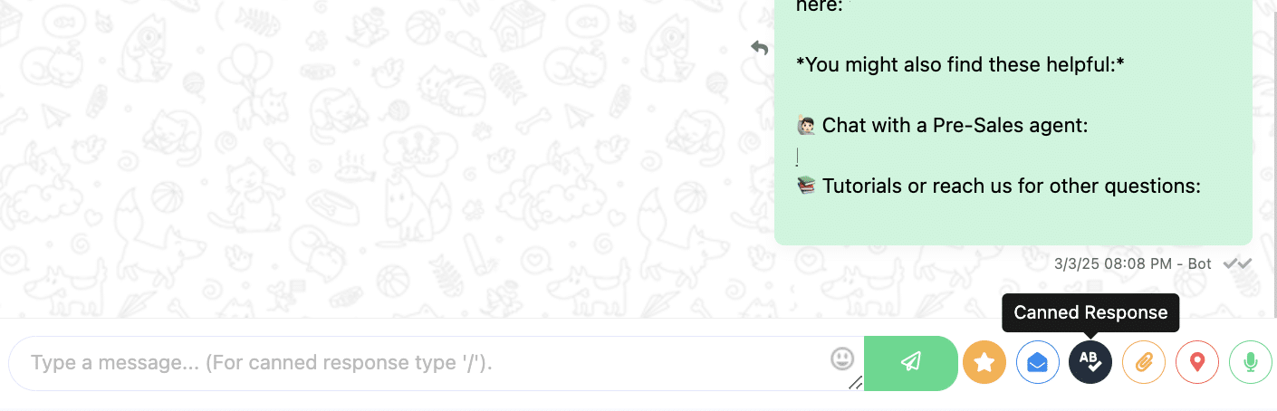 - Type “/” directly on the message box. Canned responses will be shown automatically, simply select the one you want.
