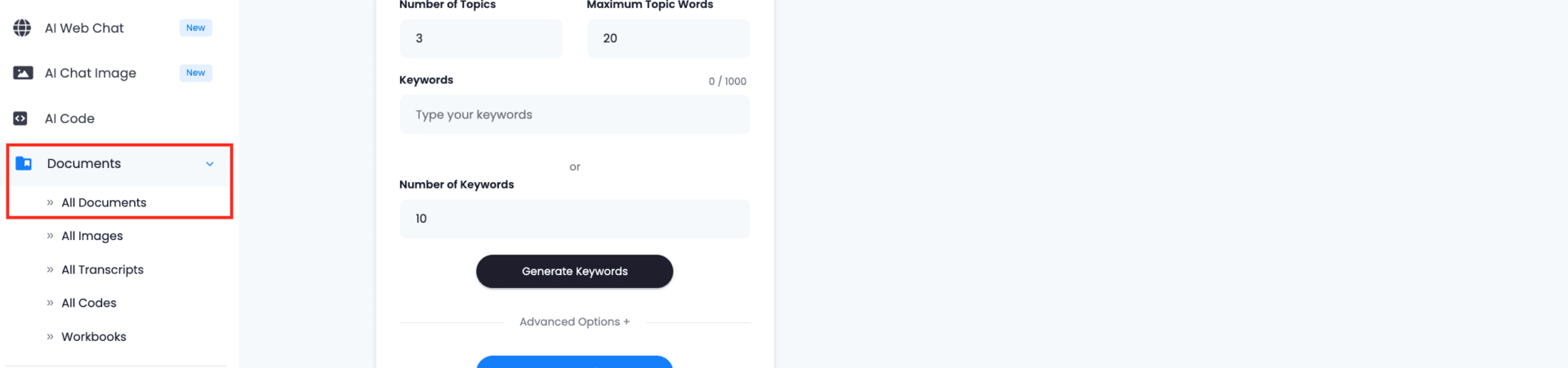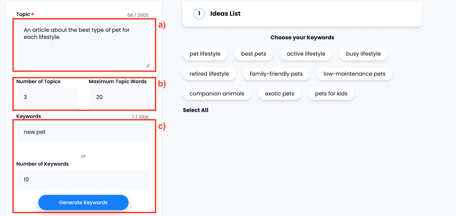 Add the number of topic ideas you wish to generate and the length of each title. Finally, input the keywords you need to use for SEO purposes. If you do not have them, the AI can provide them for you. Just indicate how many you need and click on ‘Generate Keywords’. Then, just copy them in the corresponding box.
