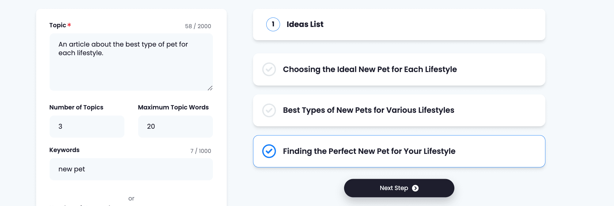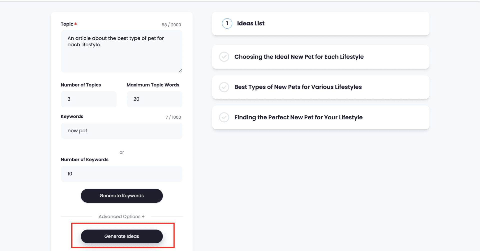 When you are done providing the details, click on ‘Generate Ideas’. The AI will provide the number of topics asked on the right panel.