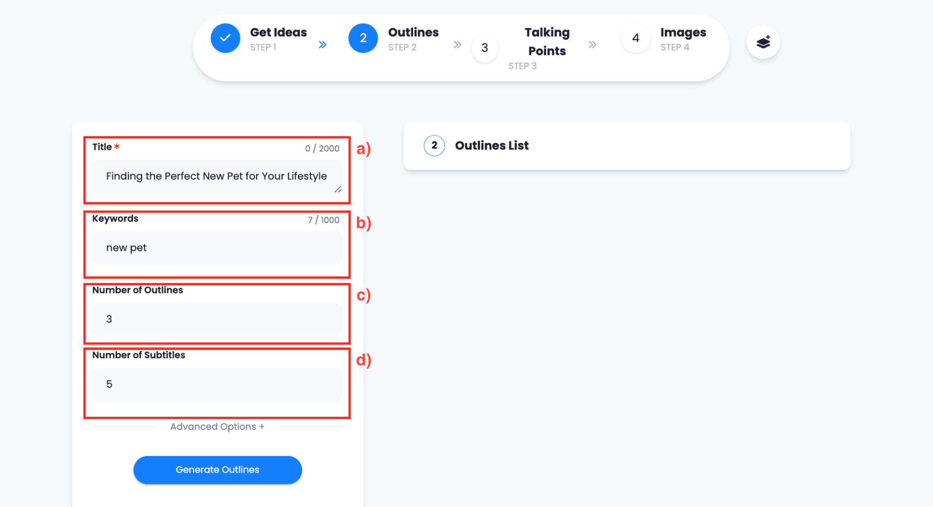 The title you previously chose will appear on the Topic box automatically. Modify it if you need to. Provide the keywords for the subtitles. You can recycle the ones you generated before. Indicate how many outline options you wish to generate and how many subtitles must each outline include.