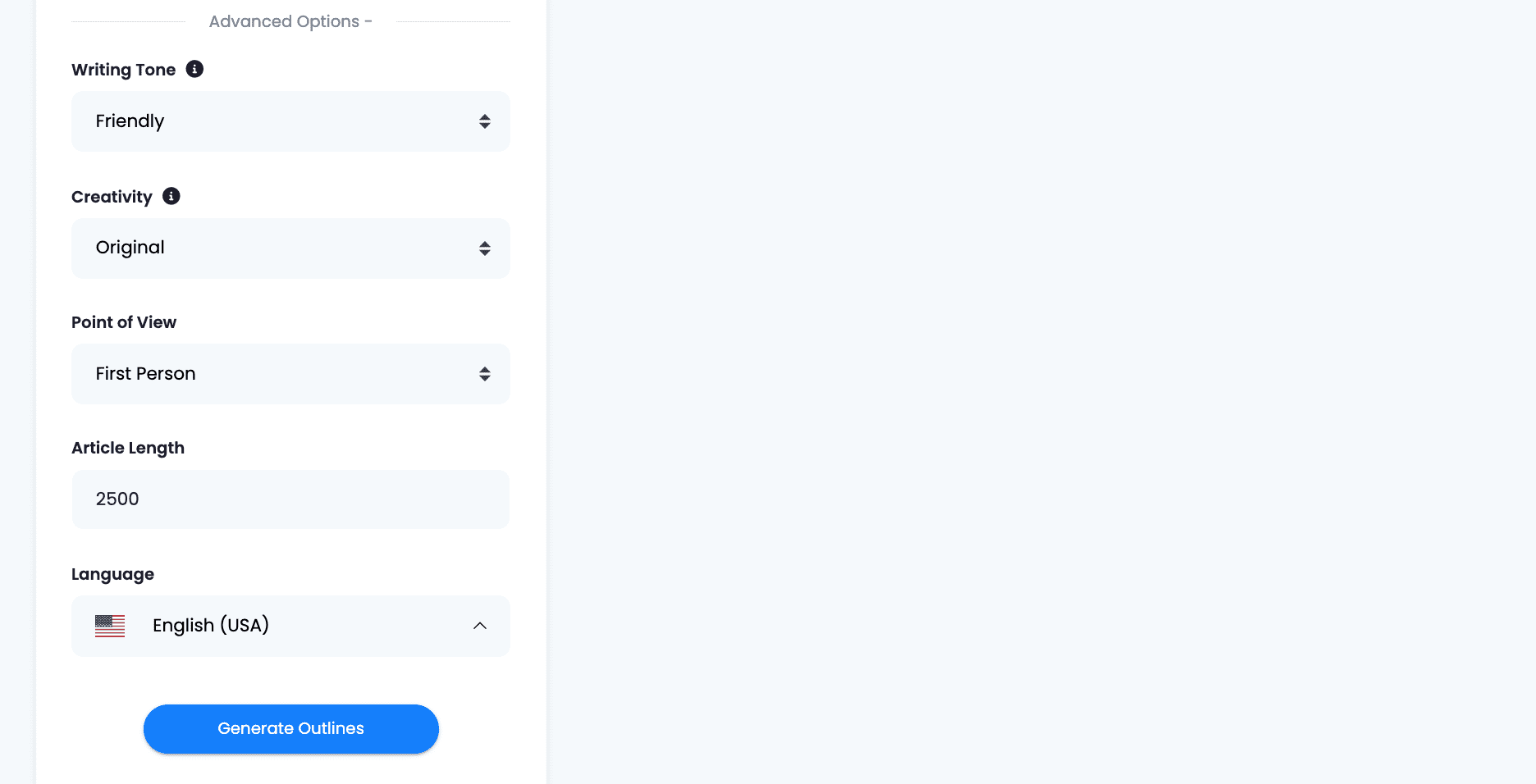 Once again, on ‘Advanced Options’ you can provide details as the language of the text, the writing tone, the level of creativity (meaning how imaginative or repetitive can the AI get), the point of view and the length (in words). When you are ready, click on ‘Generate Outlines’.
