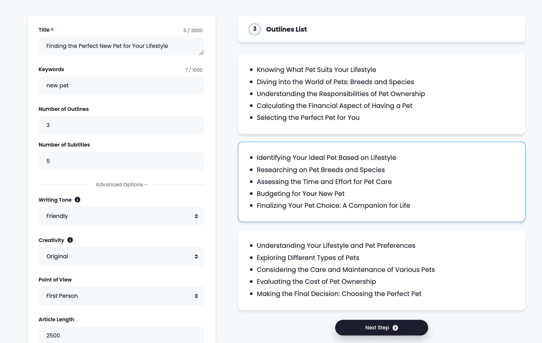 The AI will provide several outline options. Select the one you prefer and click on ‘Next Step’.