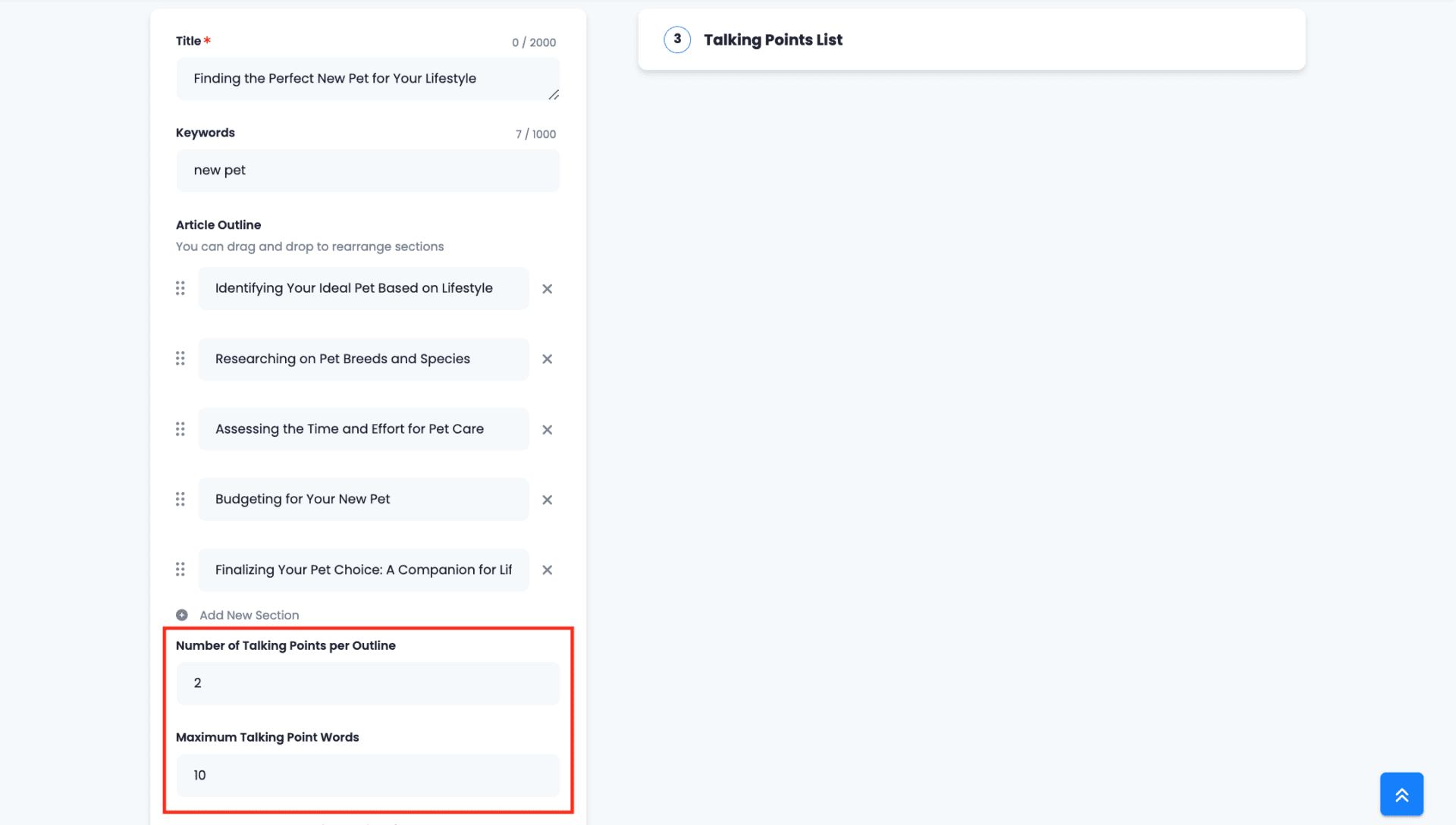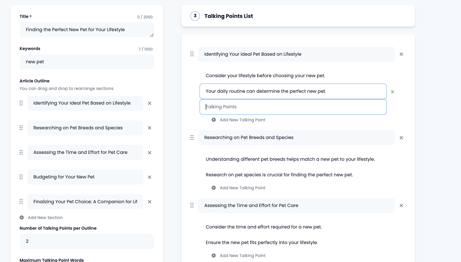 Indicate how many talking points or main ideas do you wish to include on each section, as well the max number of words on each.