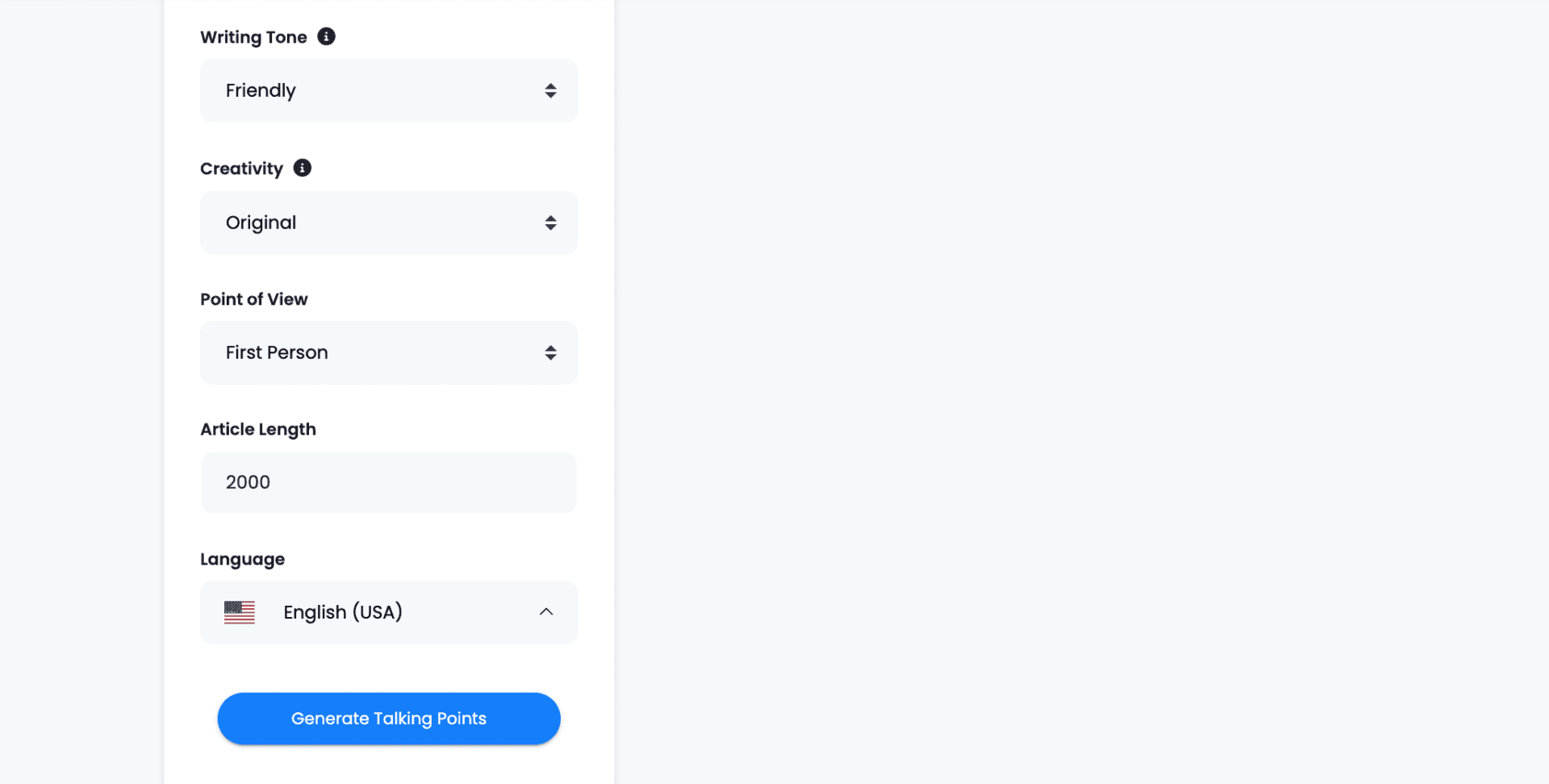 Once again, on ‘Advanced Options’ you can indicate the language of the texts, the writing tone, the level of creativity (meaning how imaginative or repetitive can the AI get), the point of view and the length (in words). When you are done, click on ‘Generate Talking Points’.