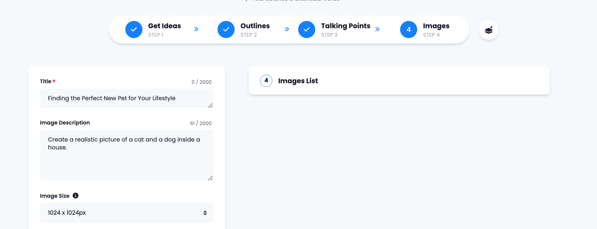 The title of your article will be placed automatically. You just need to add the description of the image you need. Provide as many details as you can to generate an accurate result. Add the size of the image you need and click on Generate image.