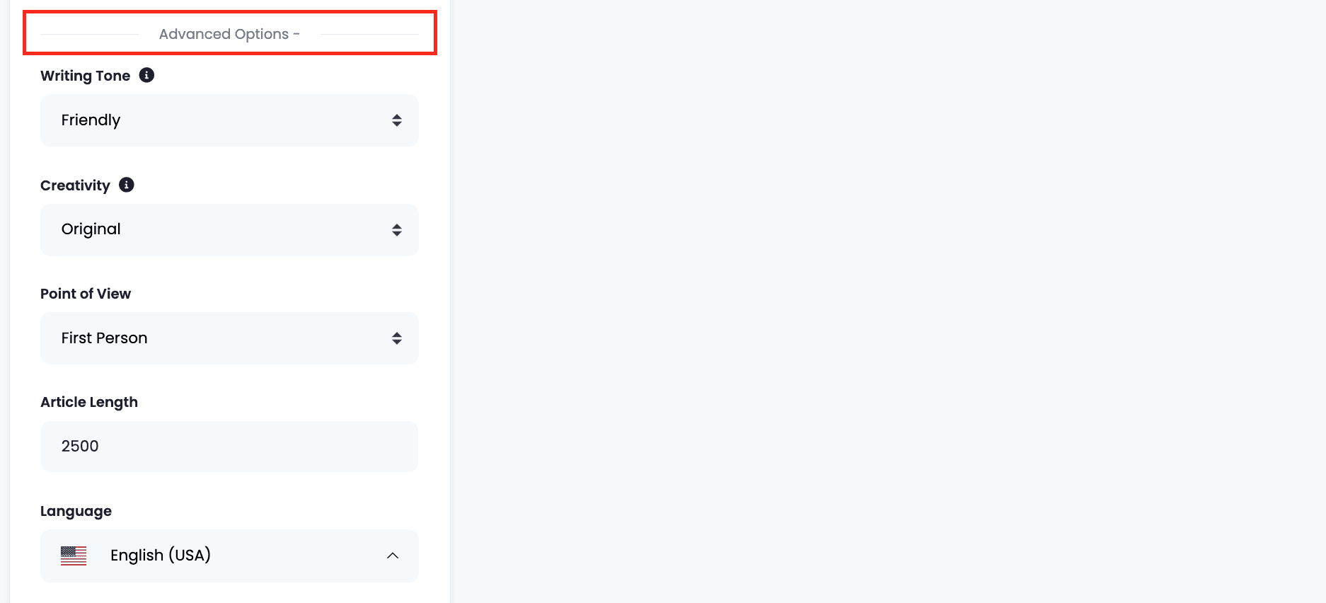 On Advanced Options, you can add additional details, like the language of the text, writing tone, the level of creativity (meaning how imaginative or repetitive can the AI get), point of view and length (in words).