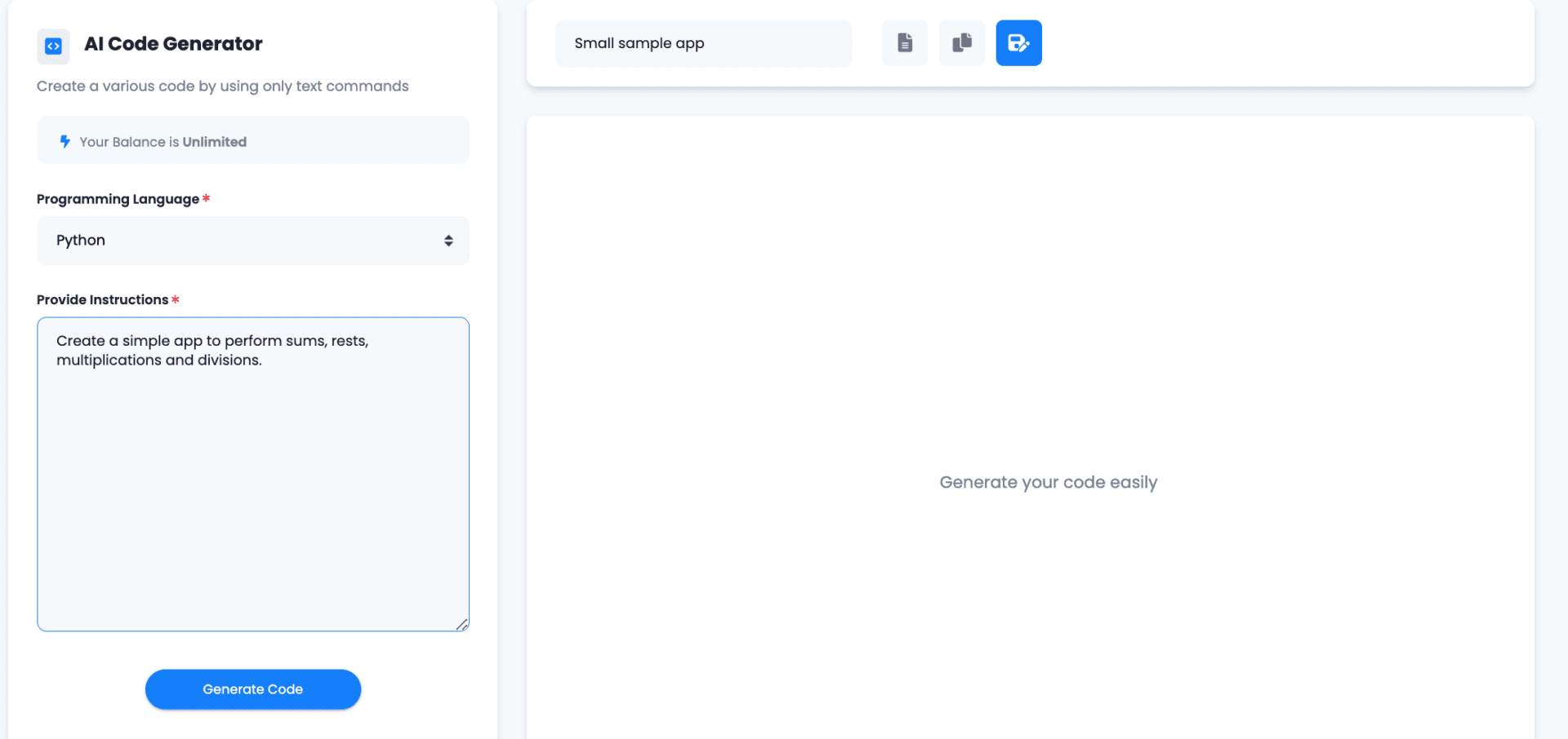 4.- Provide the instructions for your piece of code. Be as descriptive as possible for better results. When you are ready, click on ‘Generate Code’.