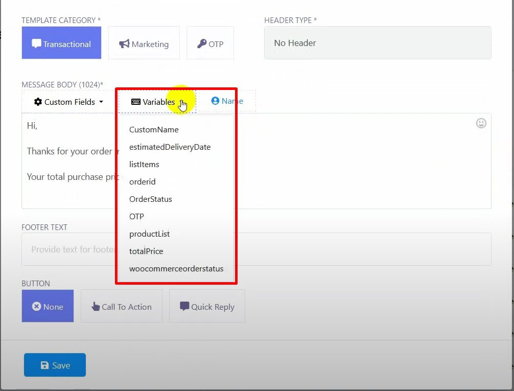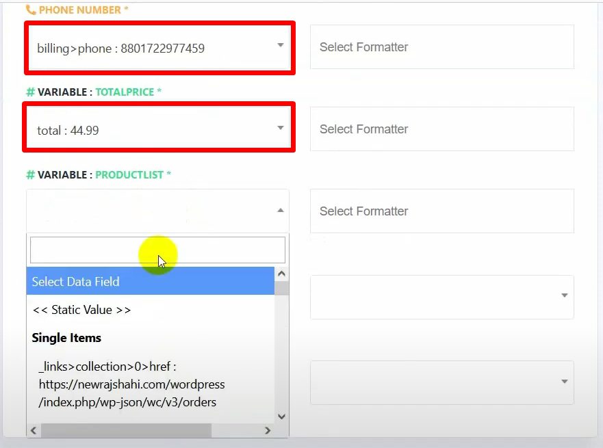 Fetch the sample data in BotCommerce and map the webhook response: Select the phone number, total price, and product list variables.