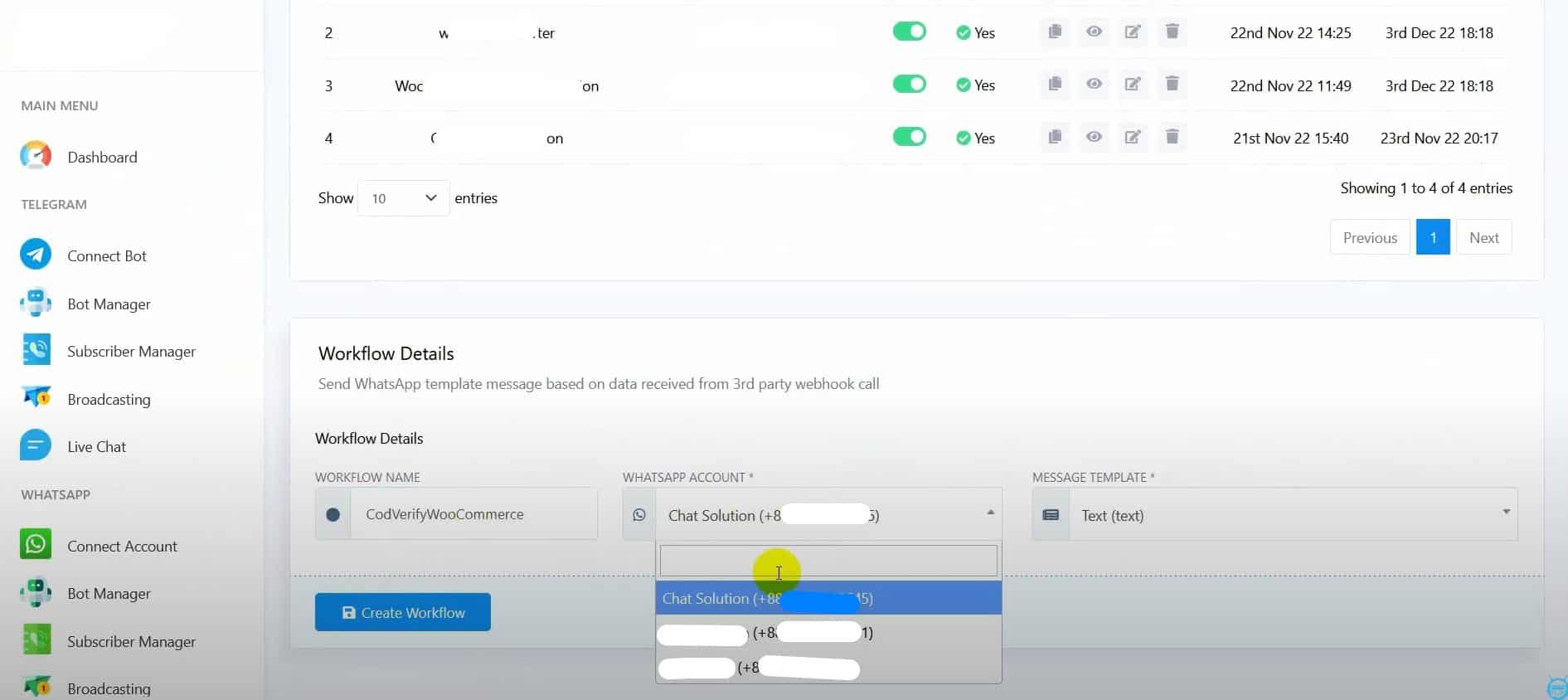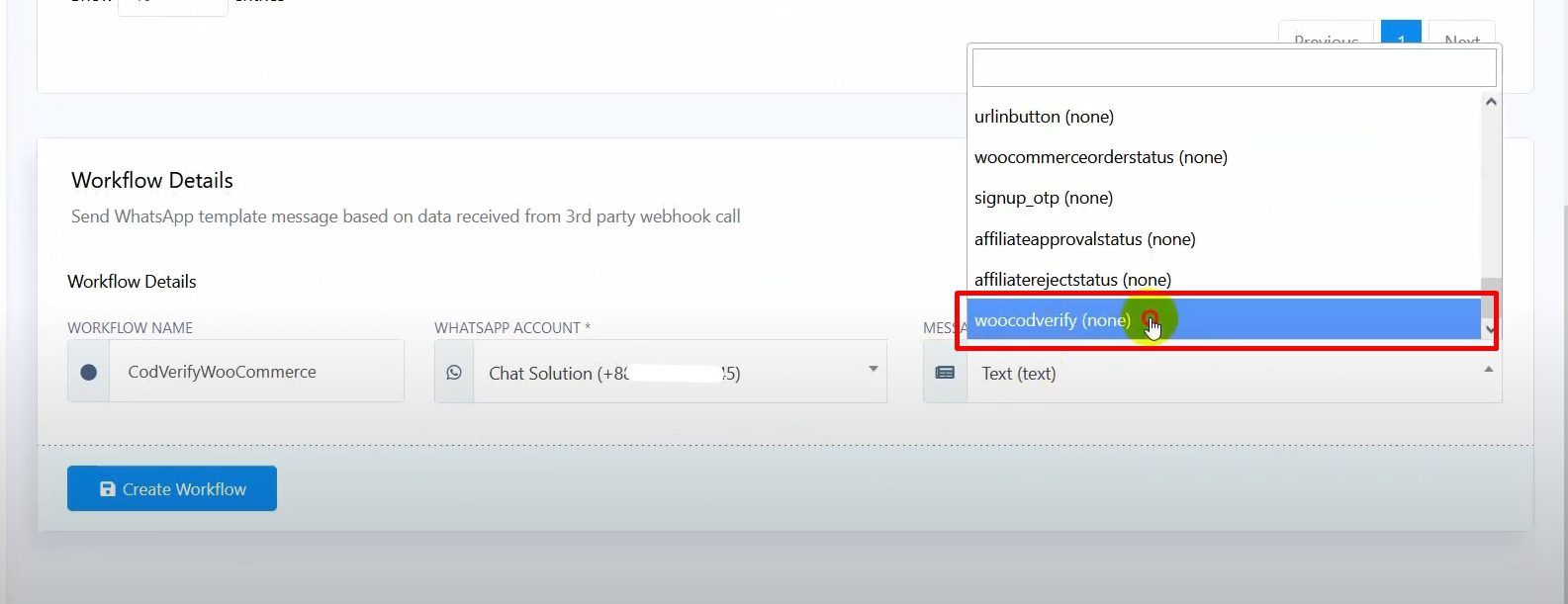 Go to Webhook Workflow, name it, and select your WhatsApp account.