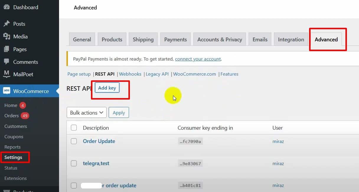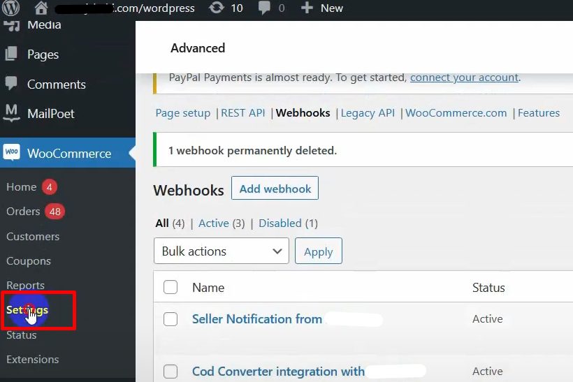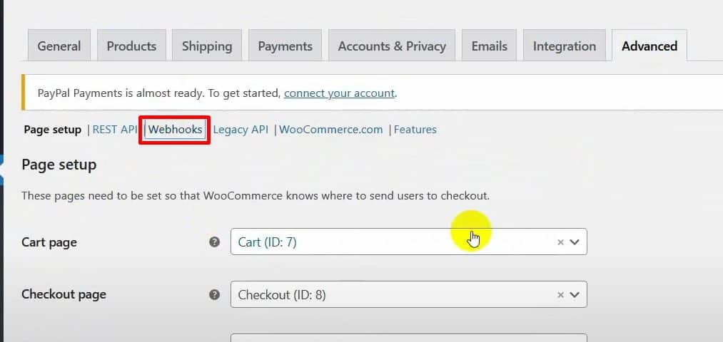 Click on “Settings”, then “Advanced”, and “Webhooks”.