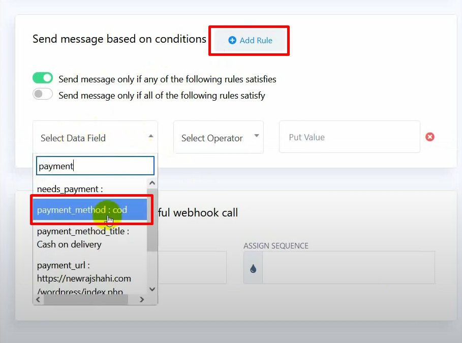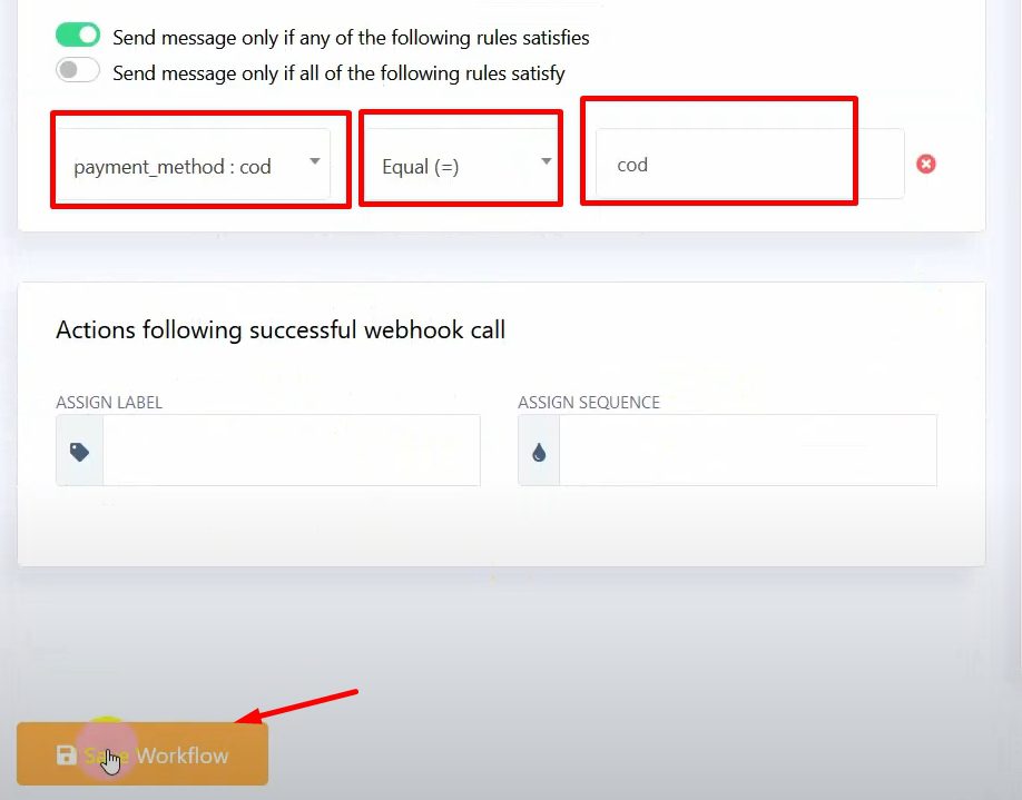 Set a rule to send the message only to orders with the payment method as cash on delivery:
