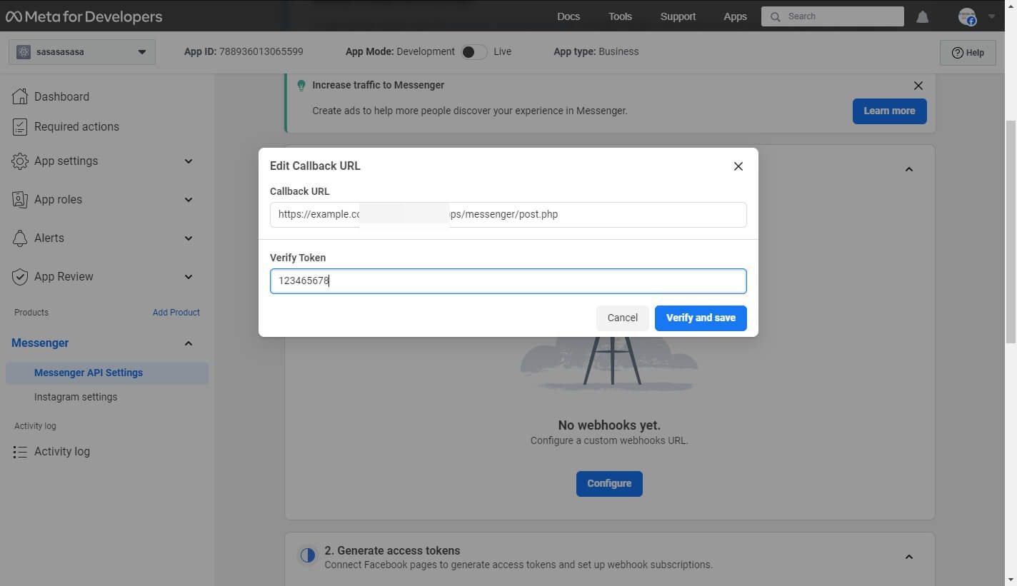 - Set the Verification Token in Settings > Messenger > Messenger and Instagram settings > Secret key and save the changes, then use it to verify the webhook.