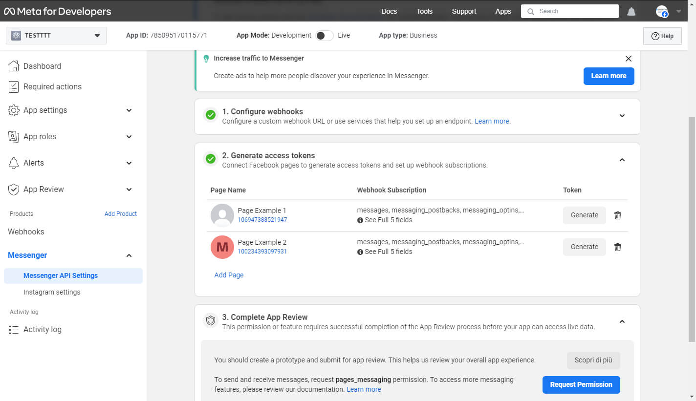 - In the Tokens column, click on Generate. Copy the access token provided and paste it into Settings > Messenger > Facebook pages.