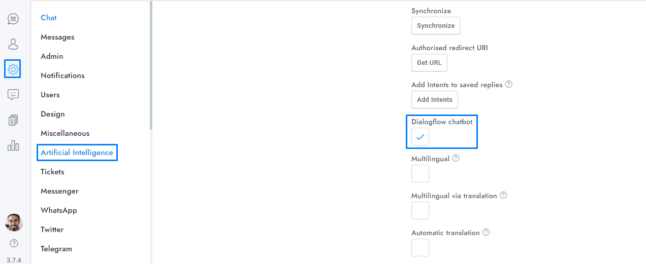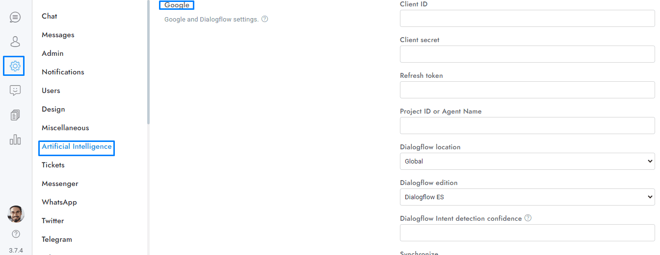 - If you want to activate the Dialogflow chatbot, check Settings > Artificial Intelligence > Google > Dialogflow chatbot. Also, you have to enter your chatbot Project ID or Agent Name, to get it follow the steps below.