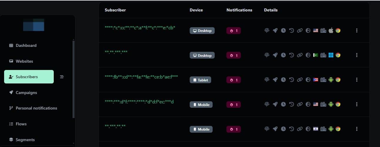 After clicking the subscribers icon, you will see a list of all your subscribers organized into four categories: Subscriber (website they belong to), Device used to access the website, Notifications sent to them, and Additional details. To view more information about a specific subscriber, click on their name.