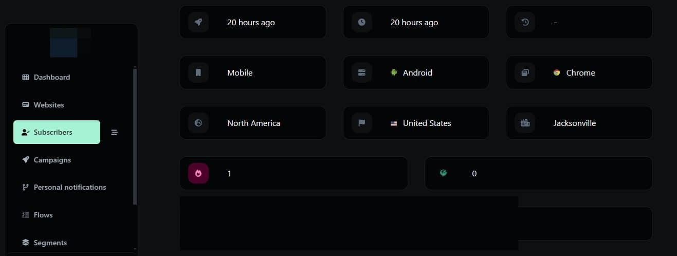After clicking on the subscriber’s name, the app will display additional information about the subscriber, including details such as the last sent notification, account creation time, device used, operating system, browser, continent, country, and city, as well as the number of notifications received, clicks, closes, and login activity on the website.