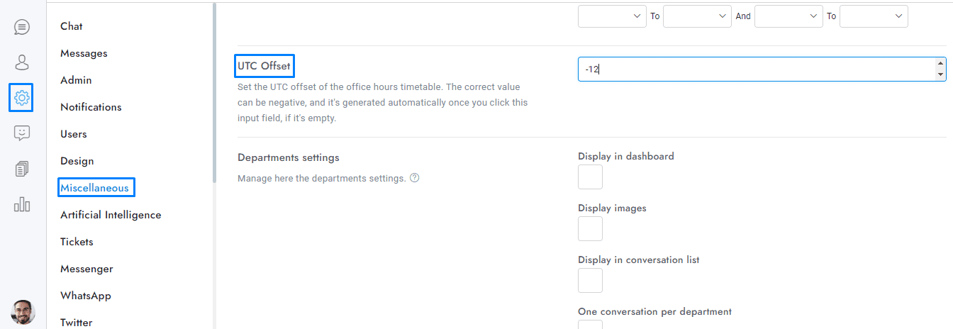 - The office hours are in UTC format. Your UTC is generated automatically when you click the field Settings > Miscellaneous > UTF offset.