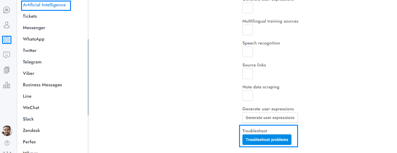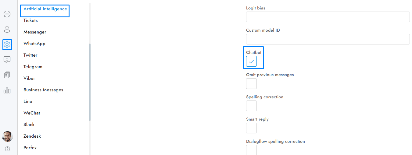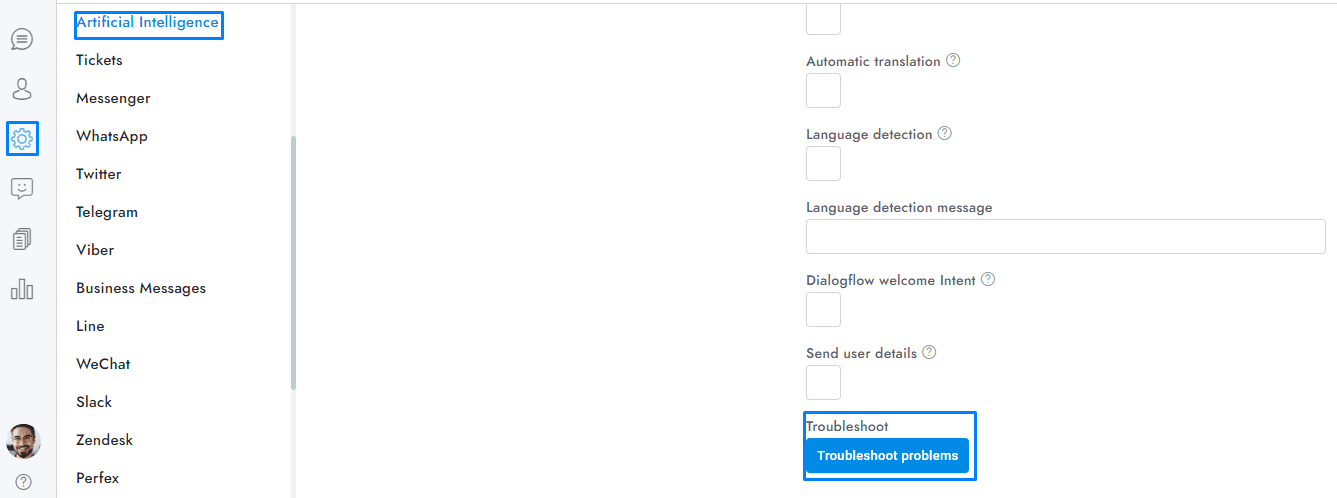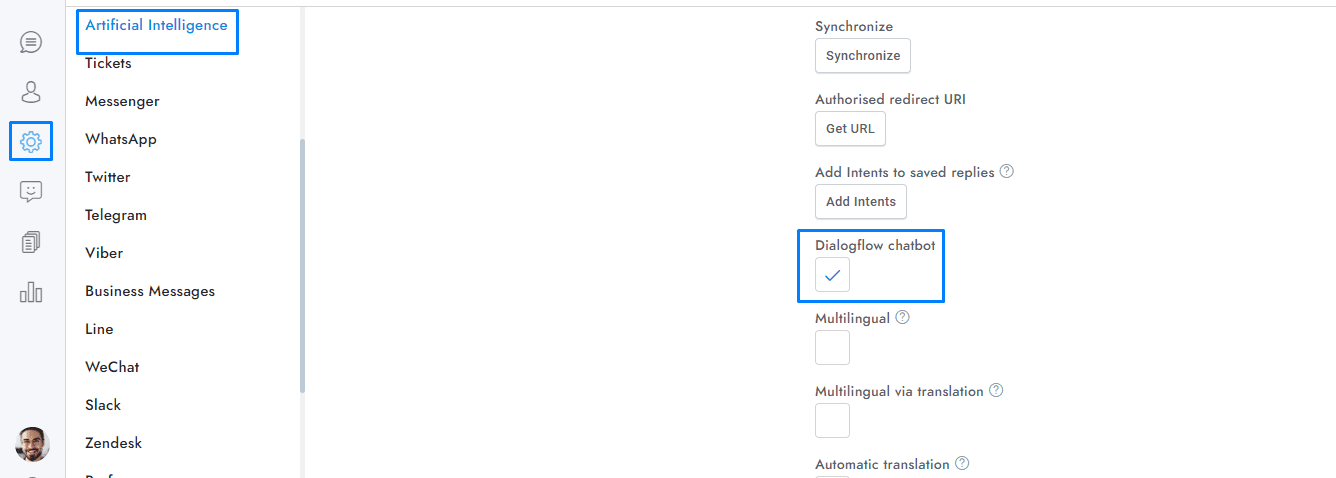 - Make sure to check the option Settings > Artificial Intelligence > Google > Dialogflow chatbot.