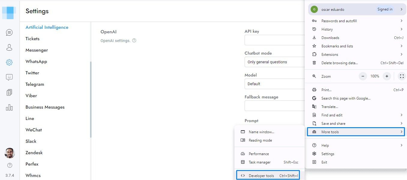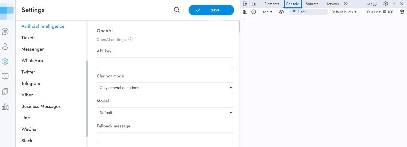 The most frequent reasons for OpenAI or Google not functioning properly are listed below. For more details about the issue, open the browser developer tools and then the console tab, send a message through the Chat chat, and an error should appear in the console. On Chrome you can open the console from Settings > More tools > Developer tools > Console.