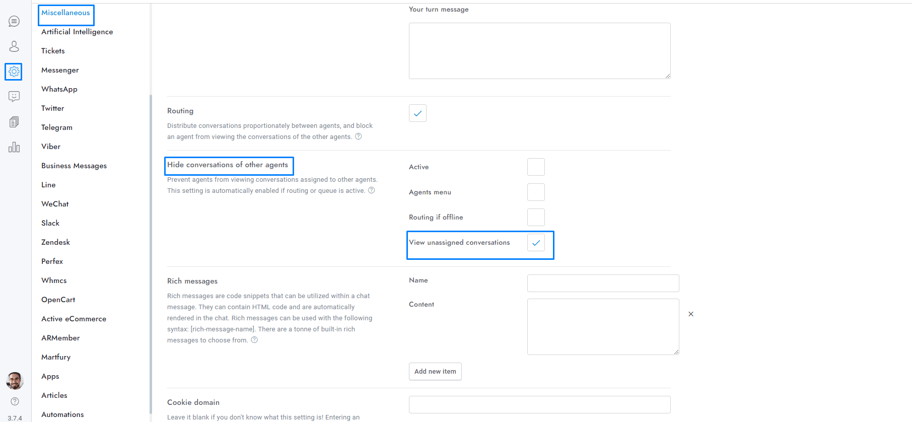 - To enable agents to view all unassigned conversations, activate Settings > Miscellaneous > Hide conversations of other agents and View unassigned conversations.