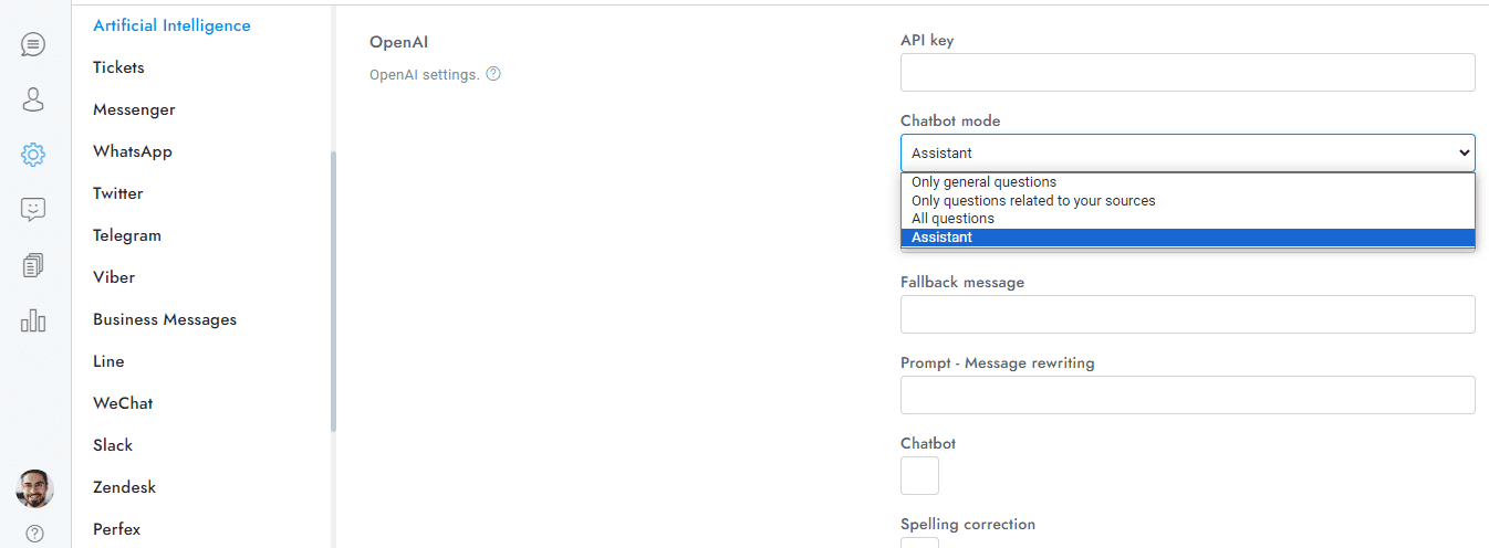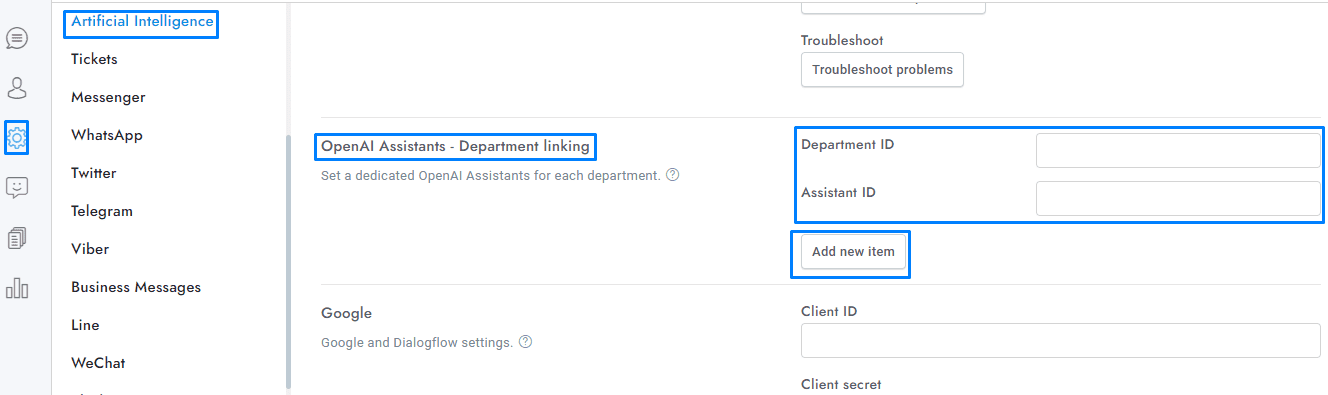 - You can use multiple assistants by adding their IDs in Settings > Artificial Intelligence > OpenAI Assistants – Department linking , and selecting Assistant in Settings > Artificial Intelligence > OpenAI > Chatbot mode. To activate an assistant, both the assistant and the conversations must be assigned to a department.