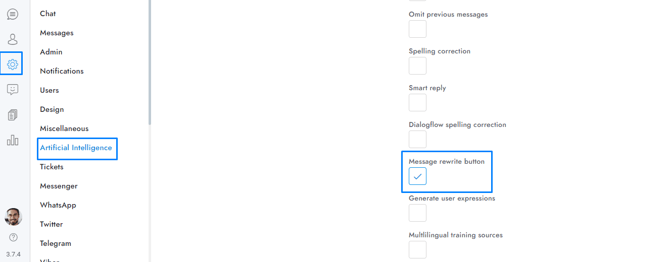 This feature adds a button to the text field of the conversation area, click on it to rewrite your message and make it more friendly and professional. Greetings will be added automatically if there is no previous agent messages. If your language is not English, you have to edit your agent/admin profile and set the correct language.