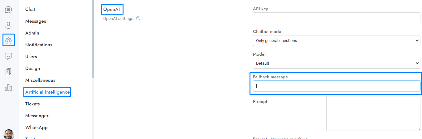 The fallback message is sent when OpenAI is unable to understand the user question. If the Dialogflow chatbot is enabled, the fallback message will be turned off and the Dialogflow chatbot’s fallback message will be utilized instead.