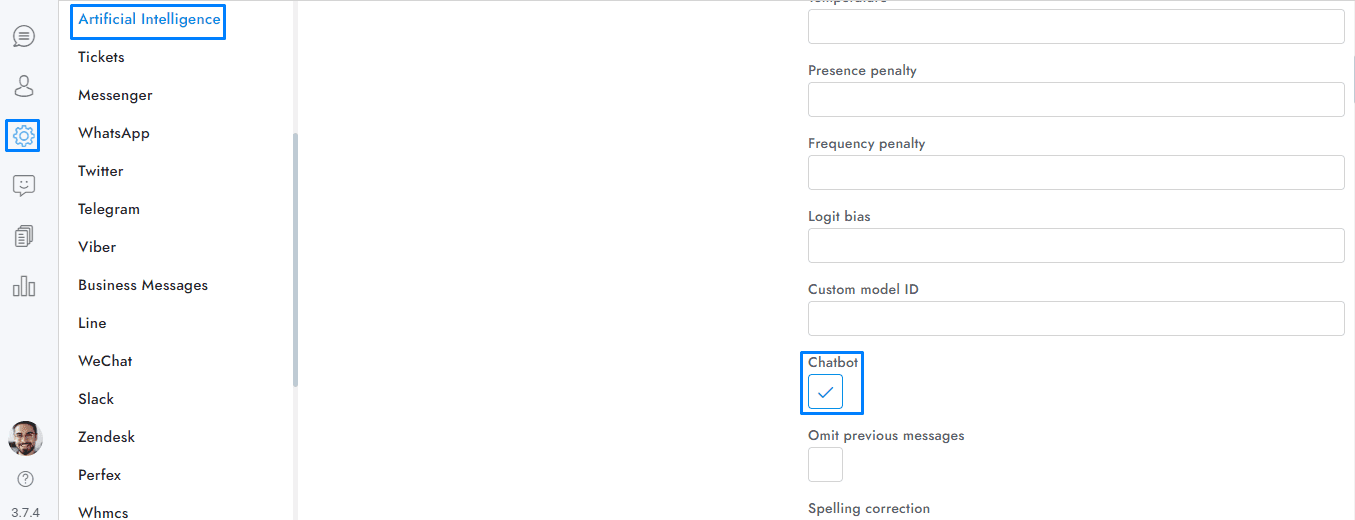 - If you want to activate the chatbot, check Settings > Artificial Intelligence > OpenAI > Chatbot.
