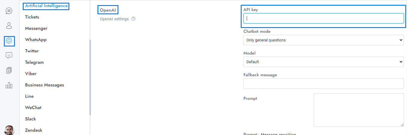 - Enable the chatbot from Settings > Artificial Intelligence > OpenAI > Chatbot.