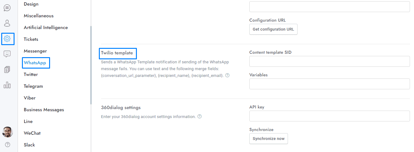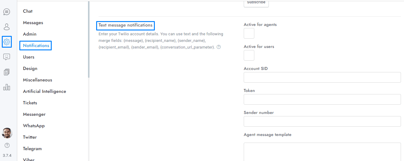 Enter the Template SID and the template attributes separated by commas into Chat > Settings > Twilio template.