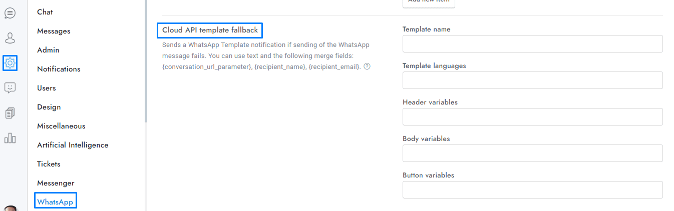 Set the WhatsApp template sent as fallback from Settings > WhatsApp > Cloud API template fallback.