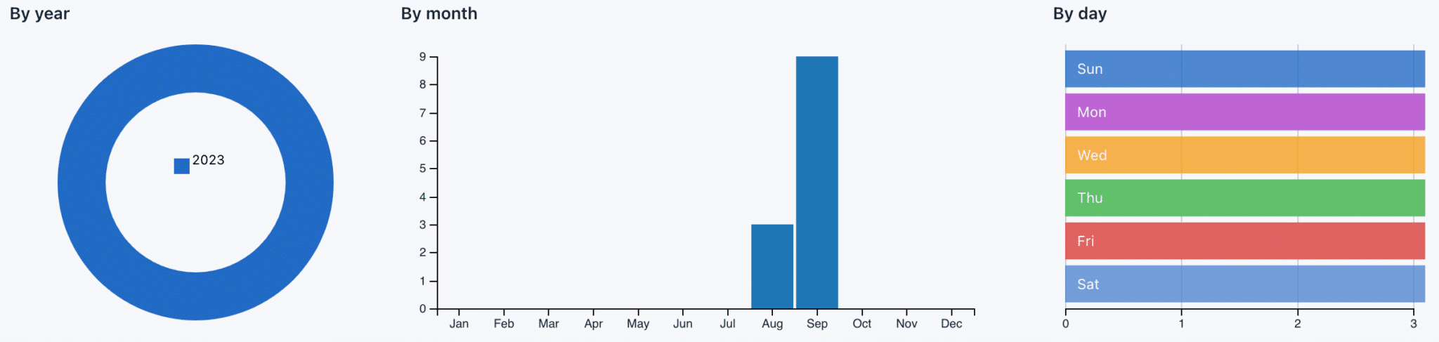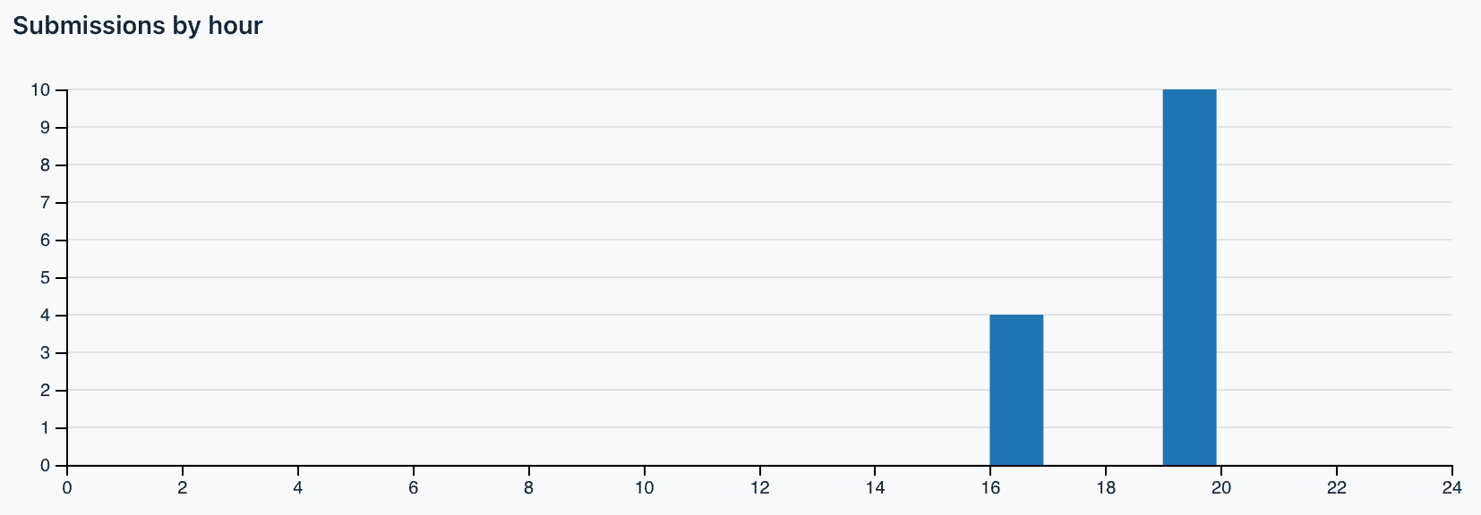 Submissions by hours: With this chart you can know in what time of the day are made more submissions. Some websites will experience peaks of traffic through the day depending on the content they publish and the audience they target. For example, a children’s website will be quiet at night, while a B2B website will be much busier during business hours.