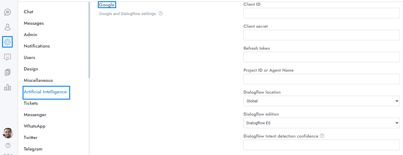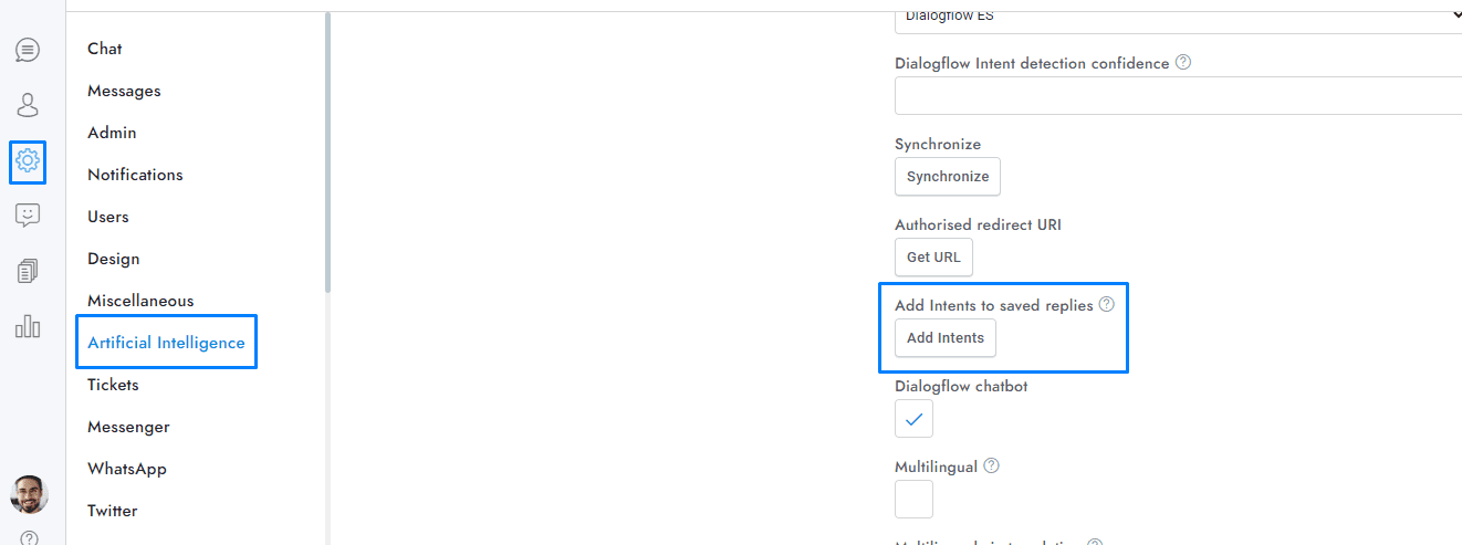 - You have the option to add all Dialogflow Intents to the saved replies list by using the setting at Settings > Artificial Intelligence > Google > Add Intents to saved replies.